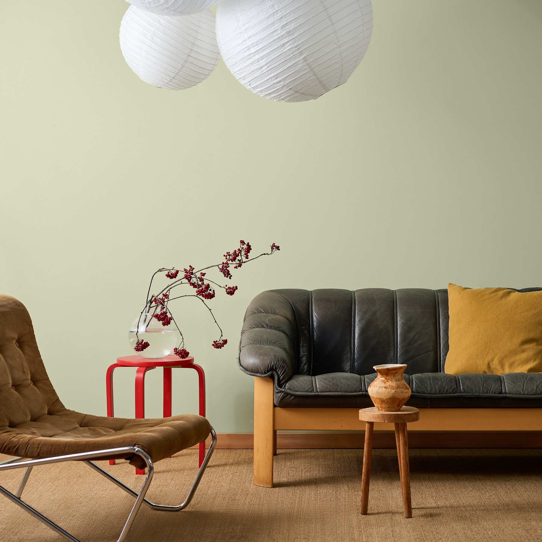 A muted, calm light green that contains a lot of warmth without feeling too yellow. Tea is a good base for red, brown and yellow details. For a unique look, combine it with different types of wood.